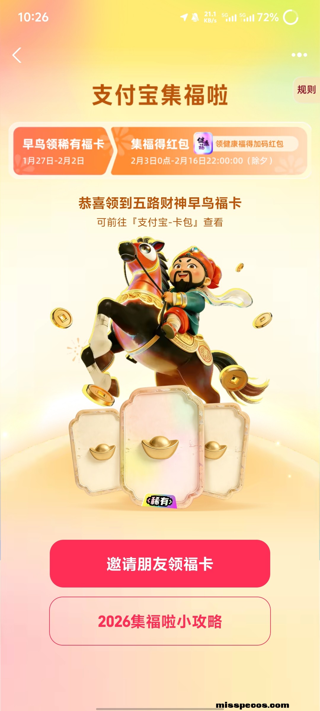 资源介绍:早鸟领稀有福卡 1月27日-2月2日 集福得红包 领健康福得加码红包 2月3日0点-2月16日22:00:00(除夕) 网址链接 https://ur.alipay.com/_rDWw